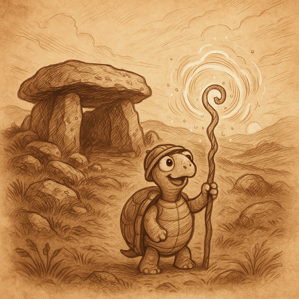 While I circled the dolmen, lining up a shot, he’d found one. Not just any stick, mind you. One that had runes. Smooth wood, carved spirals, old symbols… and just enough mischief in it to make me worry.